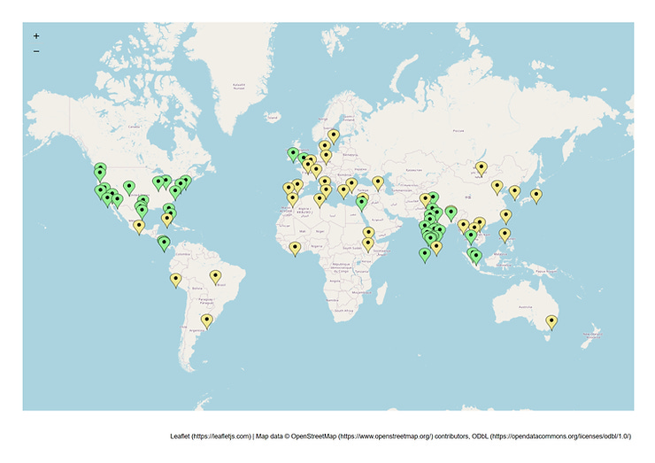 We used map customizer to map with cities we’ve eaten in marked with green and yellow markers representing cities that are the source of the cuisines we’ve eaten. Green markers are cities we have eaten in, and yellow are cities we’ve eaten from but not in. We’ve eaten in 10 countries and eaten food from 35 other countries.