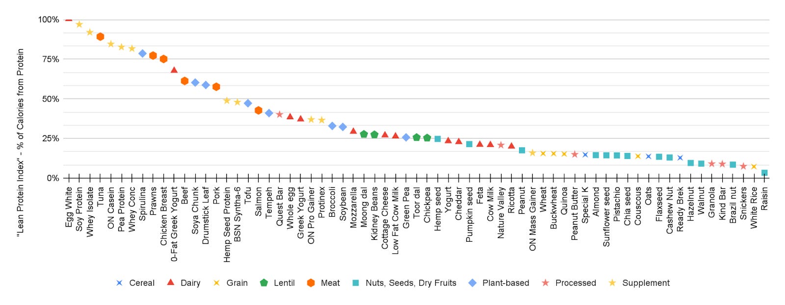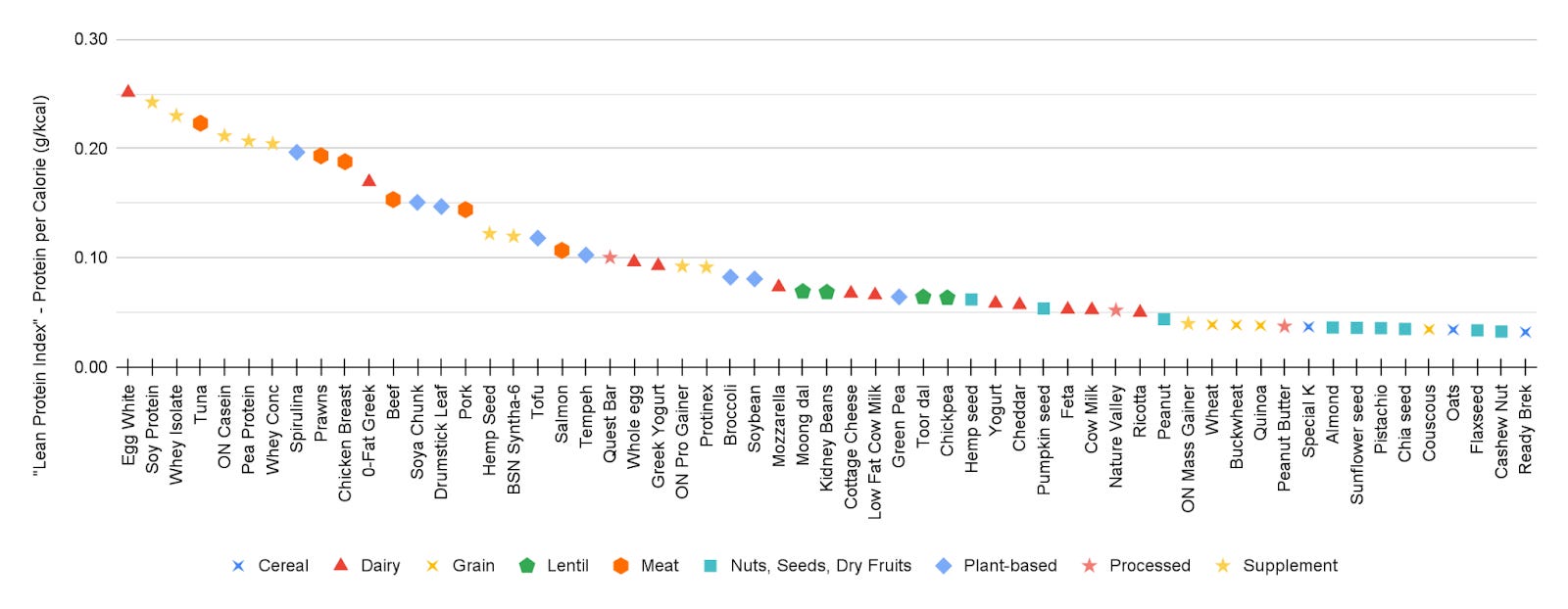 On ranking food items as per the lean protein index, we see that many dairy products shoot up in the charts. We also see that protein supplements remain at the top.