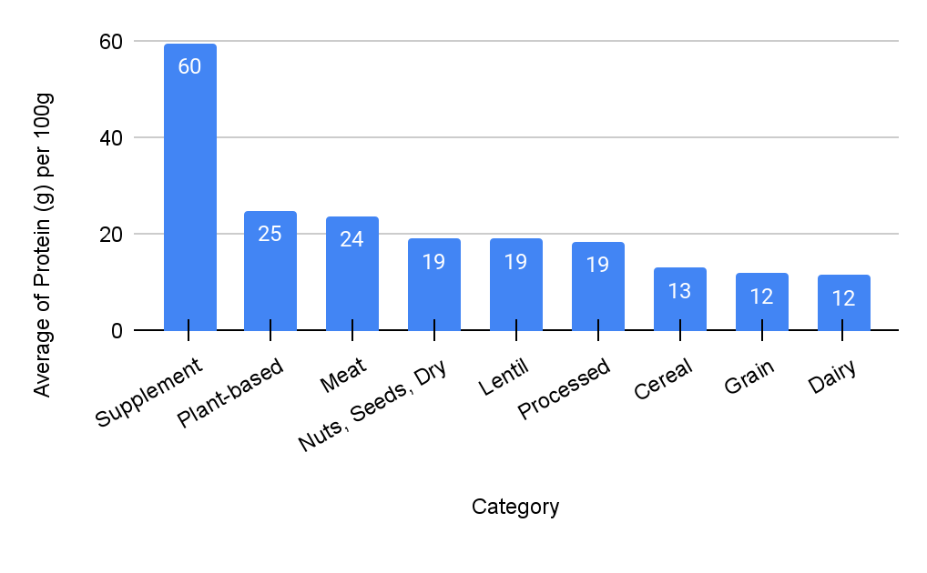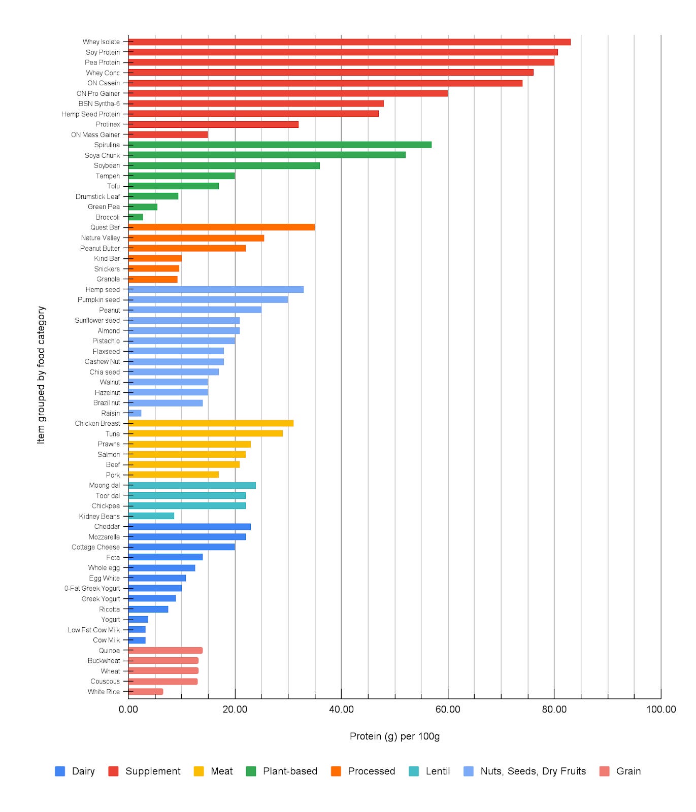 As a first approach, let’s rank the foods based on the amount of protein in 100g of the food.