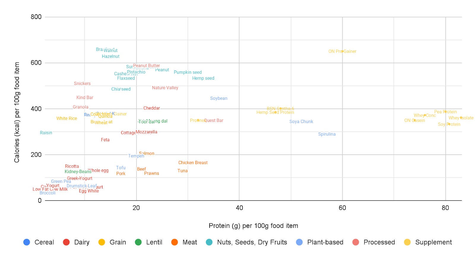 Instead of looking at protein grams, we could look at protein calories, this way we can set thresholds for the % of calories of a food item that come from protein vs other macronutrients.