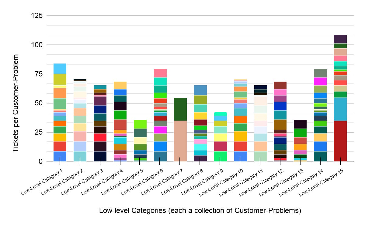 You can see a distribution of the 200 customer problems grouped by low-level categories above. Utilizing the constraints above and iteratively combining the 200 customer problems, we crystallized 15 low-level categories. We then grouped these 15 categories into 4 mid-level categories.